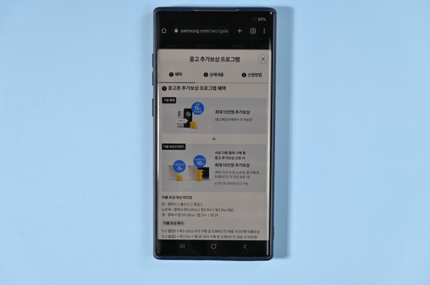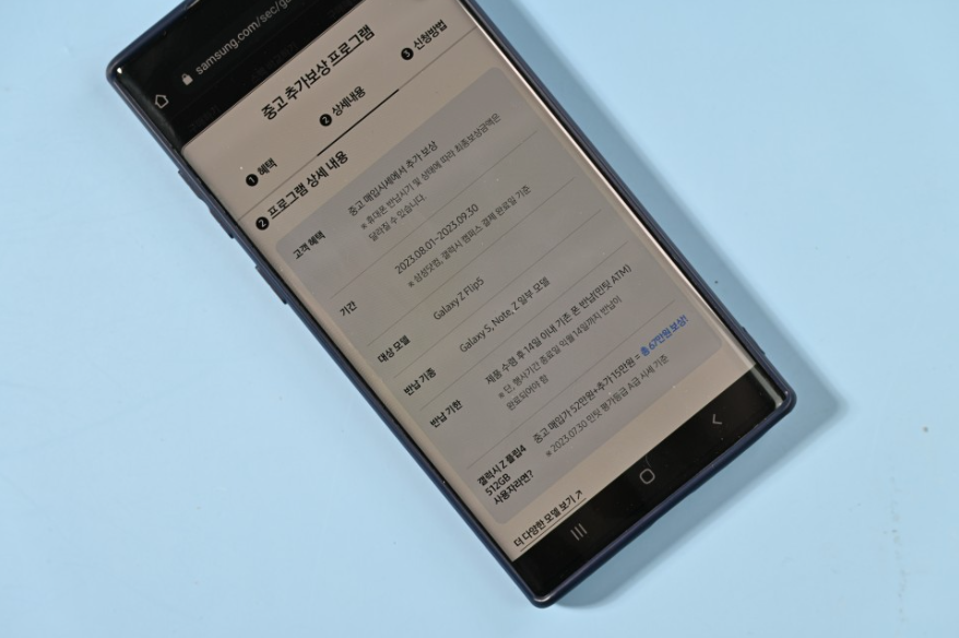 또 한가지 참고할 점은, 이번에도 갤럭시 트레이드인이 진행됩니다. 갤럭시 트레이드인은 중고 폰 추가보상 프로그램으로 신제품 구입 후 갤럭시 S, 노트, Z시리즈 일부 모델을 반납하면 중고 매입 시세에 더해 추가 보상 혜택을 제공하는 것이 특징입니다.행사 기간은 8월1일 부터 9월30일 까지이며, 최대 15만원까지 추가 보상을 받을 수 있다고 합니다. 참고로 반납 대상 모델은 삼성 닷컴에서 확인 가능하고, 최종 보상 금액은 휴대폰 반납시기 및 상태에 따라 달라질 수 있습니다.