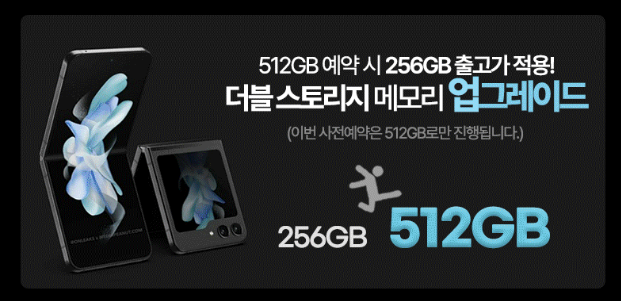 갤럭시 Z 플립 5와 Z폴드 5를 구입할 예정이라면 사전예약 혜택이 제공되는 기간인 8/1~8/7 일주일을 절대로 놓쳐서는 안 됩니다. 상당히 파격적인 혜택들이 제공되기 때문입니다. 제공되는 혜택들을 살펴보면 더블스토리지 혜택을 제공합니다. 기본 저장 용량을 무료로 2배 업그레이드해 주는 혜택으로 256GB 모델을 구입하면 512GB 모델로 업그레이드해 줍니다.