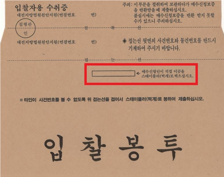 입찰 봉투를 받은 경우 입찰할 내역을 꼼꼼히 확인합니다. 간혹 보증금과 입찰가액을 바꿔 쓰는 사람도 있고 생각한 금액에서 0을 더 붙여 보즘금을 잃는 경우도 있습니다. 또는 대리인이 위임장을 첨부하지 않고 낙찰되어도 무효 처리가 되는 경우도 있으므로 꼼꼼히 확이하시기 바랍니다.