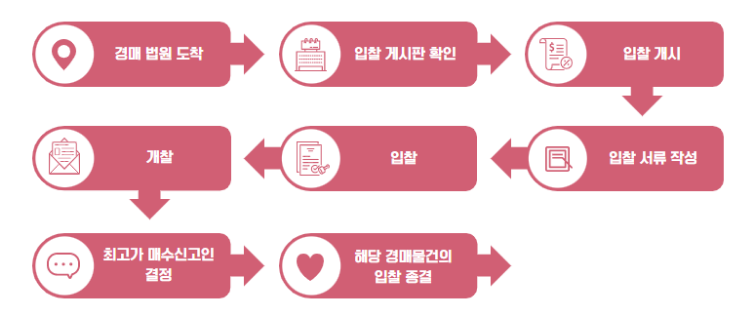 경매 시 필수로 체크해야 할 부분을 모두 검토했다면 이제 입찰을 해도 되겠는데요, 법원 경매 입찰절차는 다음과 같습니다.