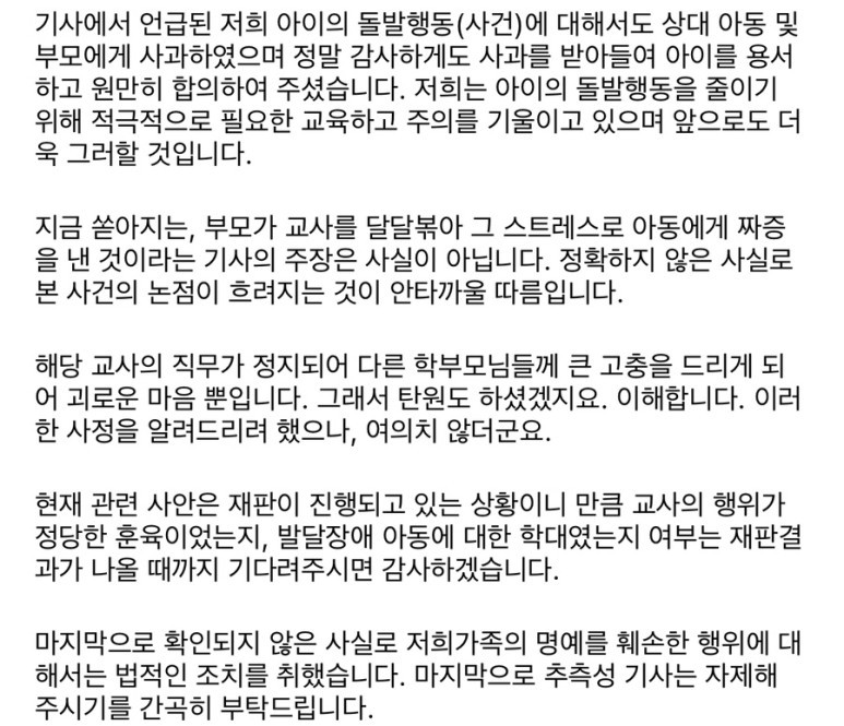 현재 재판이 진행되고 있는 상황이니 교사 행위가 정당한 훈육이었는지 아동학대였는지는 재판결과를 기다려달라.