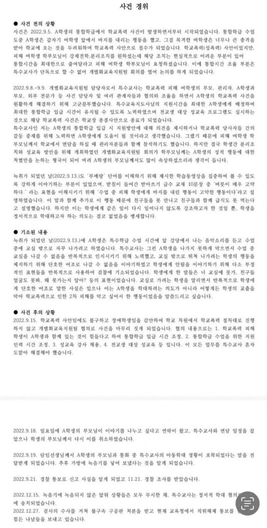 ③ 2022년 9월 8일~9월 9일 사건을 해결하기 위한 팀이 꾸려짐. 특수교육지도사의 지원 시간을 B군에게 최대한 배정하 전교생 대상 성교육 프로그램을 실시하자는 방안으로 사건은 종료가 되었습니다