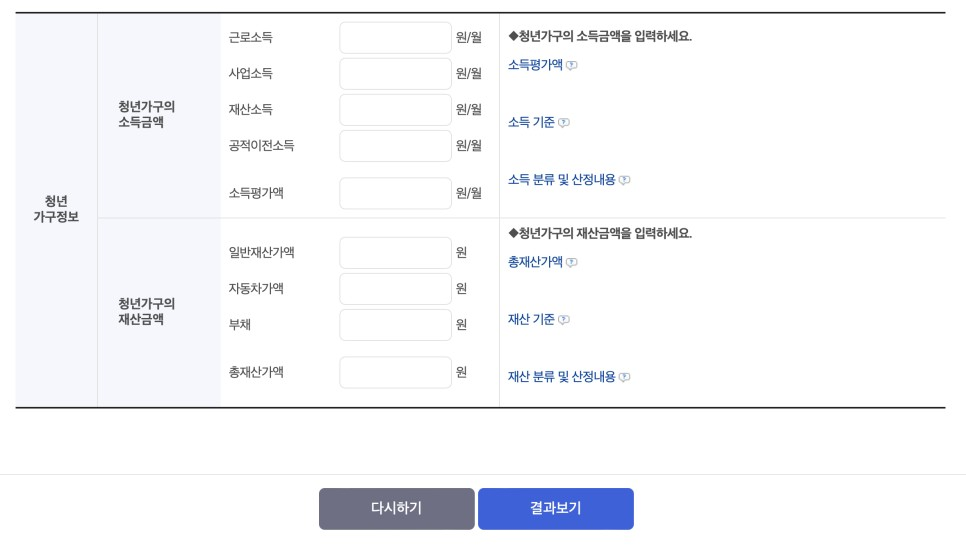 청년월세 하시 특별지원 신청 전 간단하게 소득재산항목을 입력하여 모의계산을 해볼 수도 있습니다.