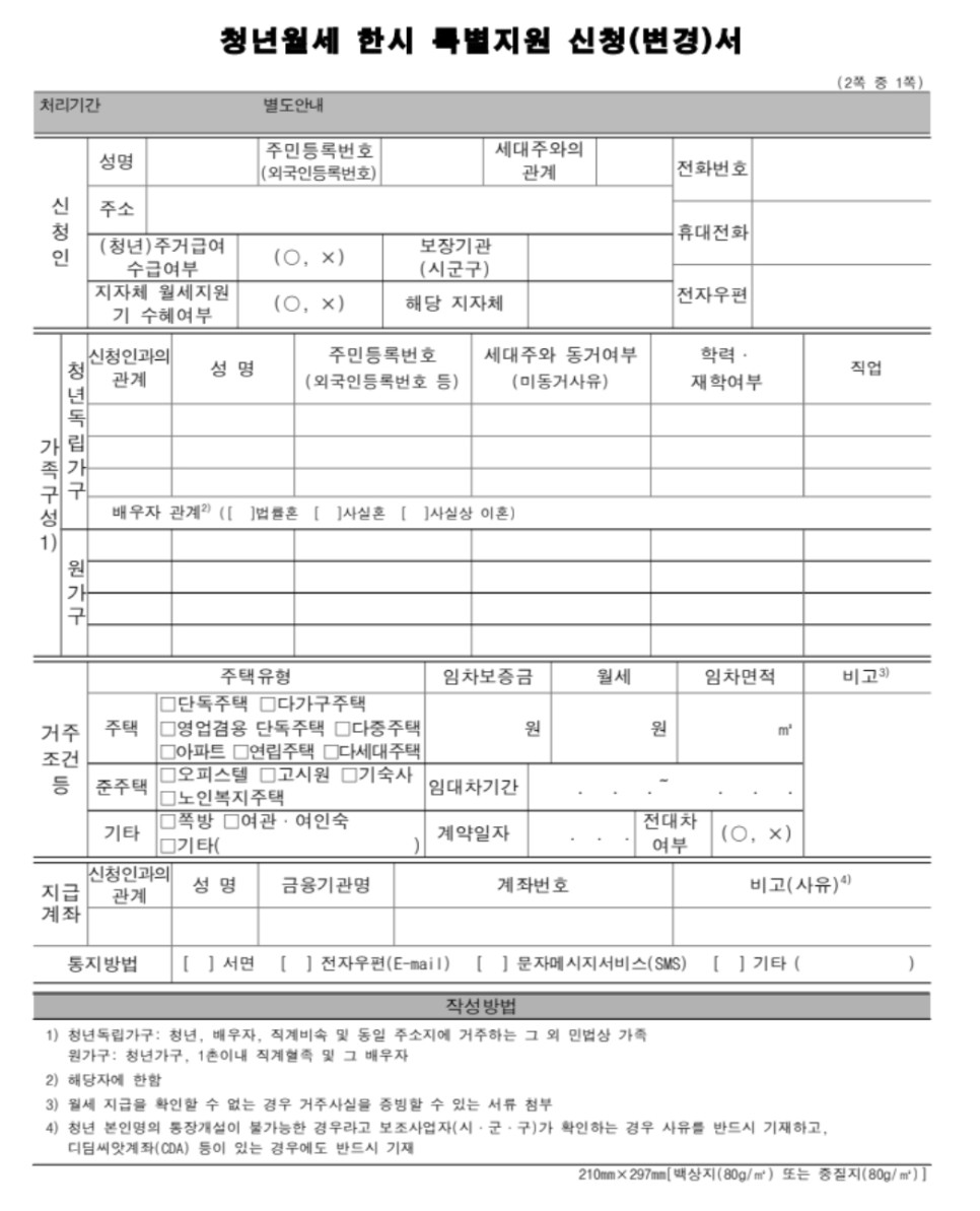 방문 신청의 경우 주소지 관찰 주민센터에서 신청할 수 있으며 청년 본인이 직접 신청을 해야하지만 불가피한 경우 대리인도 신청이 가능하며 월세는 청년 본인 계좌로 지급됩니다.